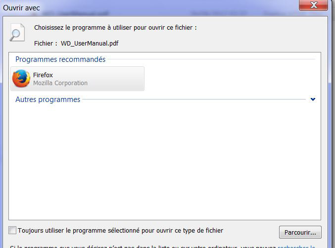 et pour l'ouvrir avec sumatra je suis obligée d'ouvrir d'abord sumatra puis de chercher le fichier pdf... Dans Firefox/Options/contenu,j'ai précisé l'ouverture avec sumatra mais pour mes fichiers du PC avec l'icône firefox rien de changé Qui peut me dire comment faire que sumatra ouvre par défaut mes pdf???