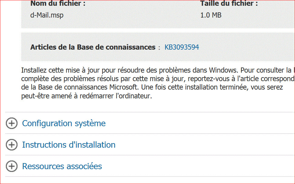 Astucienne | bonjour je viens de recevoir ceci de Microsoft, (misère) je panique -------------------------- Cher utilisateur, Au cours des prochaines semaines, nous apporterons certaines modifications à vos services de messagerie qui pourraient avoir une incidence sur votre compte de messagerie @outlook.com, @hotmail, @live ou @msn. Ces changements vous empêcheront de recevoir vos courriels dans l’application Windows Live Mail 2012 que vous utilisez. Pour continuer à utiliser Windows Live Mail 2012 afin d’envoyer et de recevoir des courriels par l’entremise de votre compte, vous devez installer la dernière mise à jour publiée ici. ----------------------------------- voici la mise jour Mise à jour pour Windows Live Essentials Mail 2012(KB3093594)--------------------------------------------------
